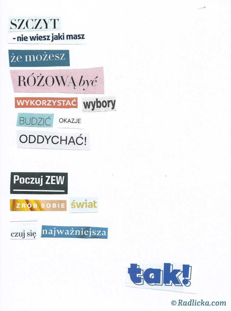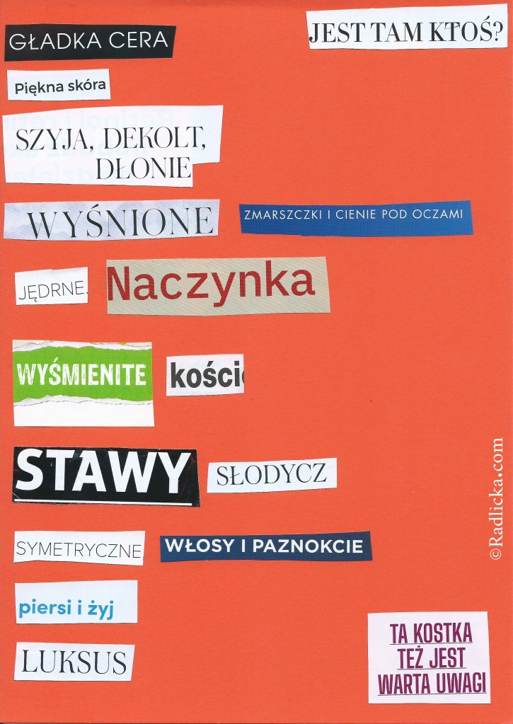 Przedstawiam zatem nowy kolaż z wycinanek. –Jest tam ktoś? -Tak pytamy, chociaż wiemy, że nie ma. Chociaż mamy nadzieję na niemożliwe spotkanie. Jesteśmy samotni jak Pluton na obrzeżach Układu Słonecznego. Ale zaraz, zaraz! Może dobry towarzysz czai się w naszym ciele? Może pora się zaprzyjaźnić ze sobą kawałek po kawałku? Poznać na nowo. Zachwycić, choćby i kośćmi czy zmarszczkami. Zapraszam do eksperymentowania!