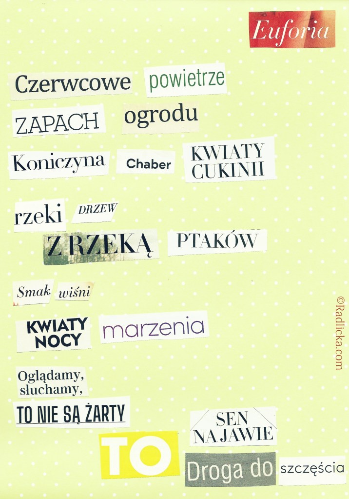 Ale się złożyło, że akurat jest czerwiec – w życiu i na kolażu! Cieszmy się słoneczkiem, deszczykiem, liśćmi, zapachami, kwiatami i śpiewem wszelakich stworzeń (no, poza komarami i muchami, oczywiście!). Wiadomo, że w lipcu i sierpniu będzie podobnie, ale jednak natura nie czeka zbyt długo i powoli zmienia swoje przebrania z późnowiosennego na wczesnoletni. Doceńmy jej czerwcowy outfit!
